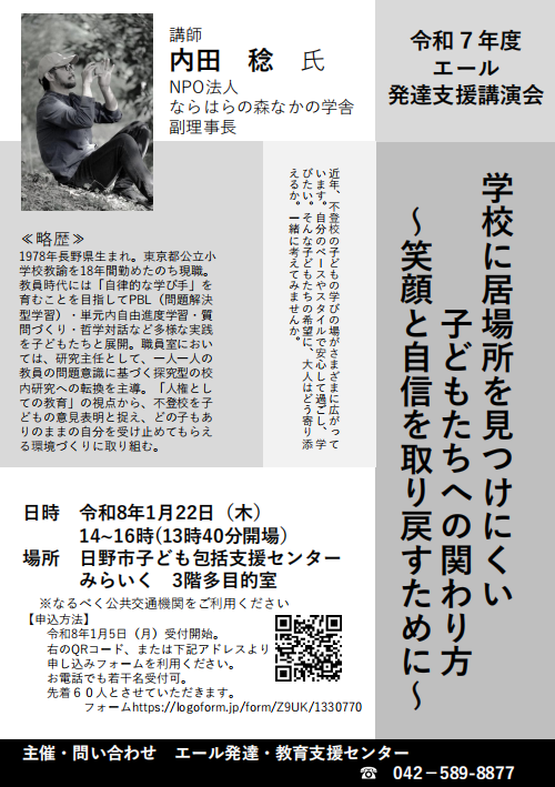 「学校に居場所を見つけにくい子どもたちへの関わり方 ~笑顔と自信を取り戻すために~」と題し、なかの学舎スタッフ内田が日野市教育委員会 発達・教育支援課主催のエール発達支援講演会にて講演を行います。ご興味のある方は、ぜひご参加ください。